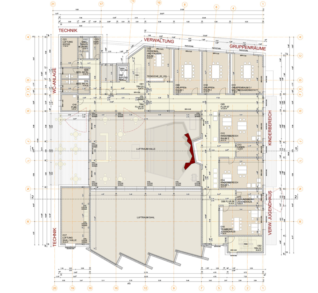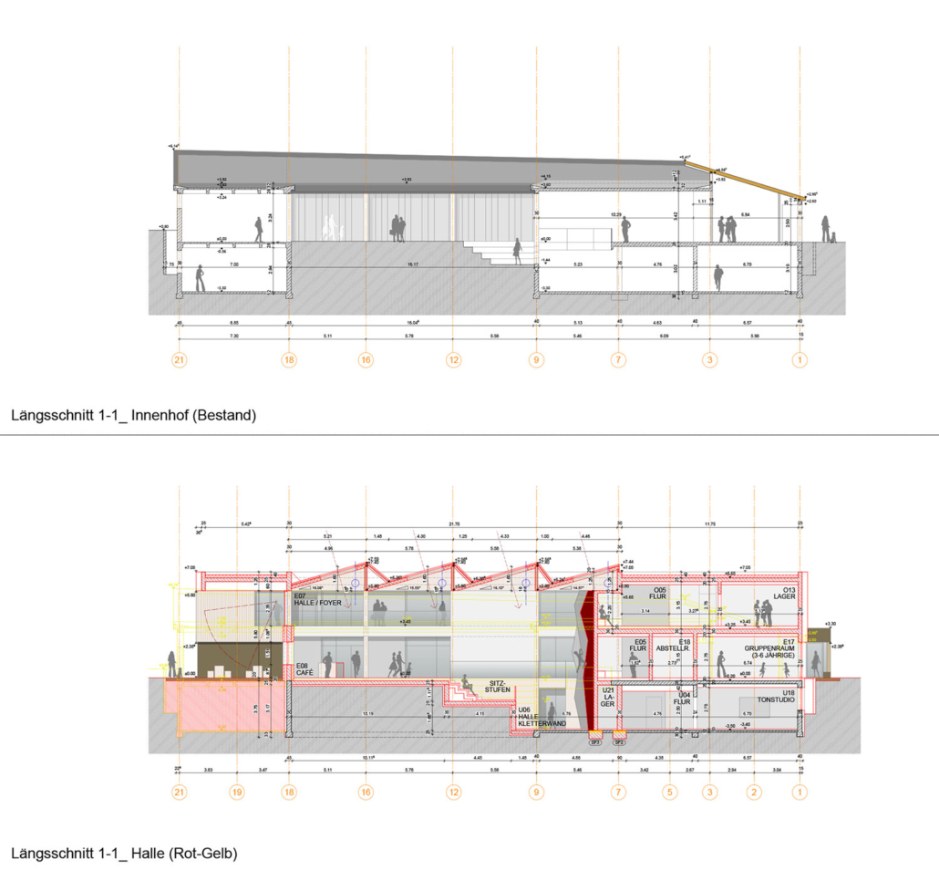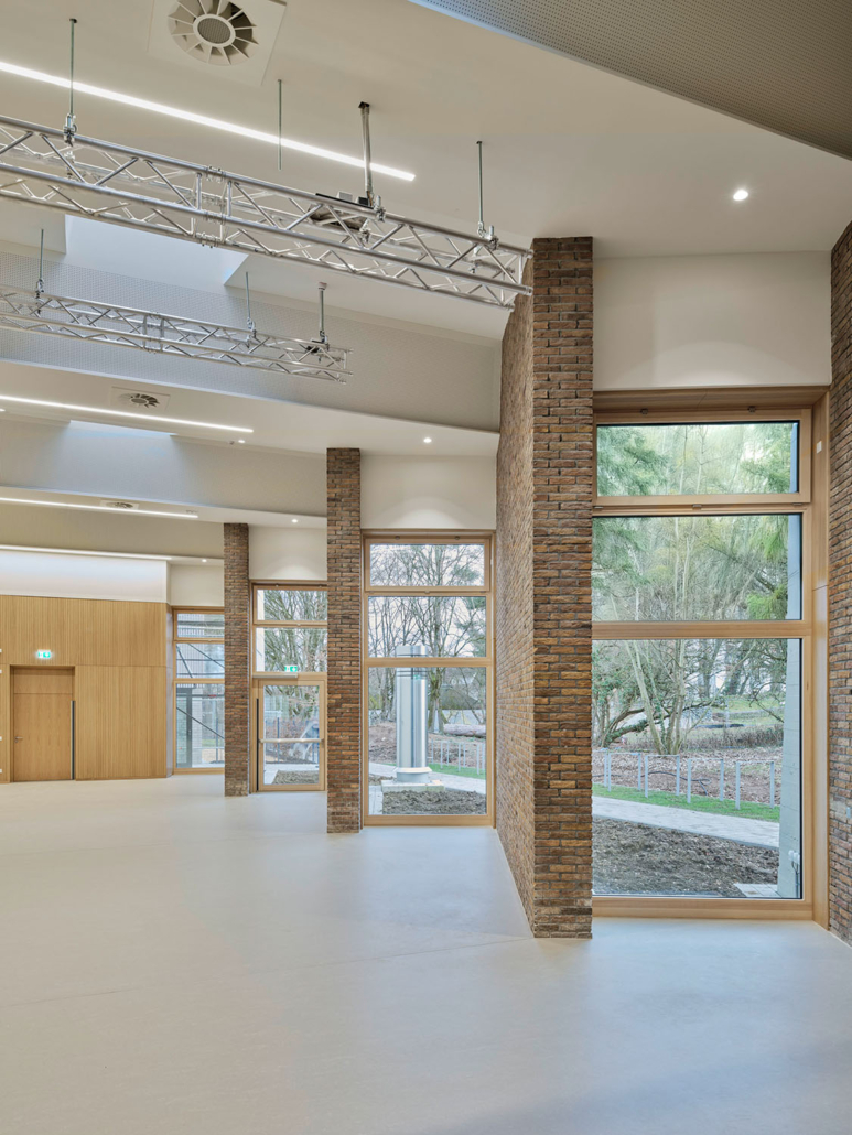 Gestalt- und Identitätsprägend für das Bestandsgebäude war der im Grundriss mehrfach aufgefächerte Veranstaltungssaal mit seinen Ausblicken in den Grünraum. Der Saal wurde aufwendig saniert und mit neuer Veranstaltungstechnik, u.a. für Rock- und Jugendkonzerte versehen. Seine Holz-Sheddach-Konstruktion wurde zur Überdachung des Innenhofes in Längsrichtung weitergeführt. In der so neu entstandenen Eingangshalle beeindruckt heute die über 3 Geschosse verlaufende neue Kletterwand.