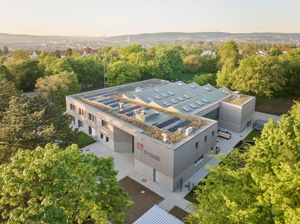 So wurde das u-förmig um einen offenen Innenhof angelegte und vollunterkellerte 1-geschossige Gebäude teilweise rückgebaut. Ressourcenschonend wurde das neue Gebäude auf dem Fußabdruck des bestehenden errichtet, mit einer Erdwärmeheizung und PV-Anlage versehen und um ein Geschoss aufgestockt. Bestehende und neue Konstruktionen wurden miteinander verbunden.