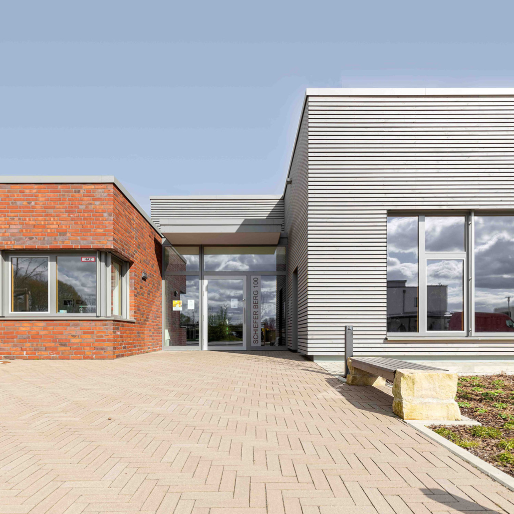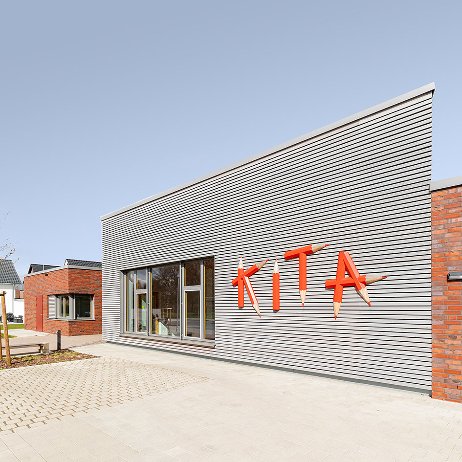 Die 4- zügige Kindertagesstätte wurde als kompakter, trapezförmig sich in das Grundstück einfügender, eingeschossiger Baukörper konzipiert.