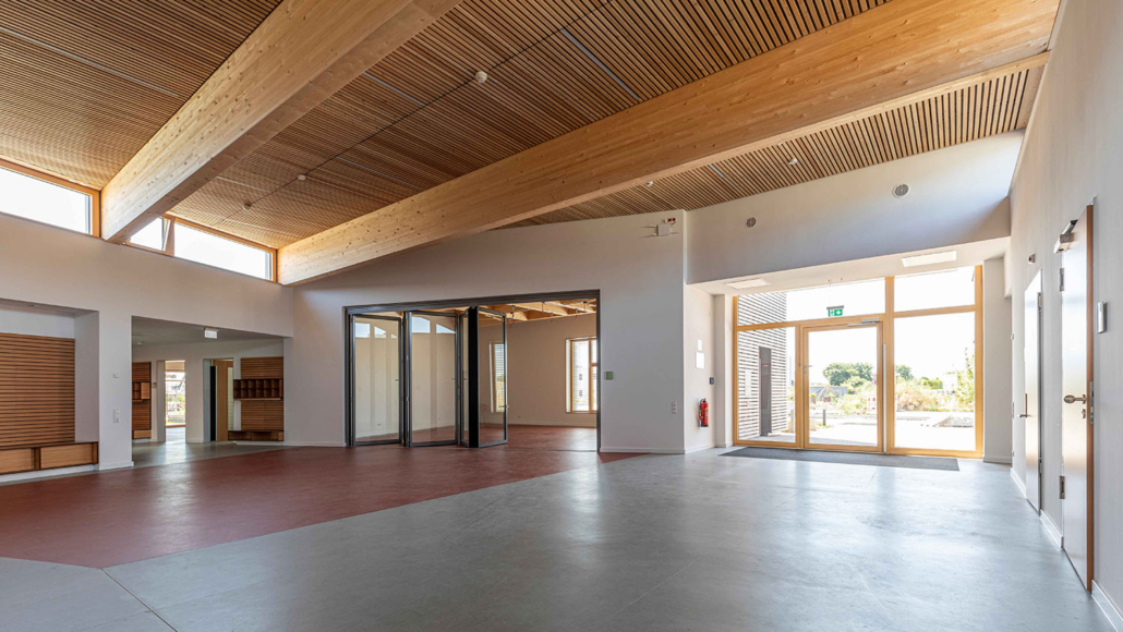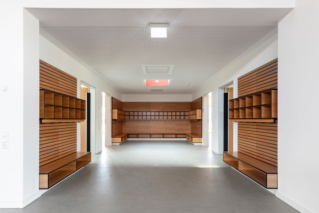 Der zentrale Innenraum bietet den Vorteil einer von allen Kindern vielfältig nutzbaren Fläche. In Verbindung mit dem Mehrzweckraum, der sich zur Halle öffnen lässt, entsteht ein großer, gemeinsam nutzbarer Kommunikations-, Spiel- und Veranstaltungsraum. Gleichzeitig bieten die Vorbereiche zu den Gruppenräumen identitätsstiftende Nischen und Rückzugsbereiche für die Kinder.