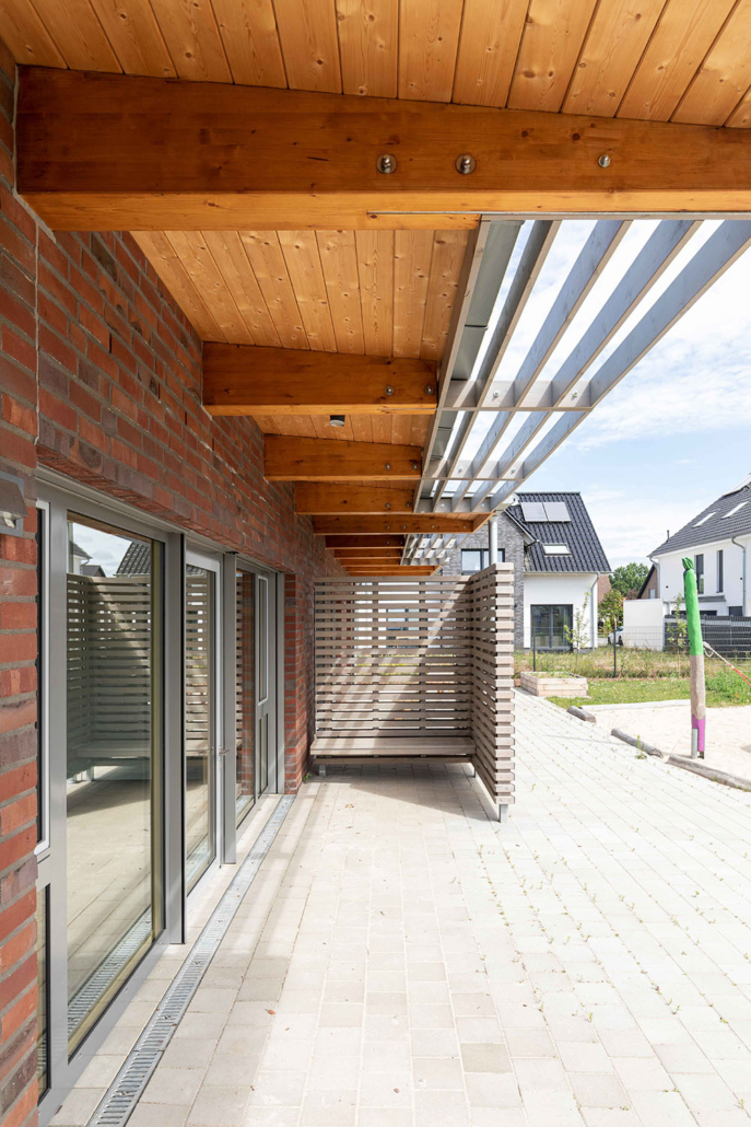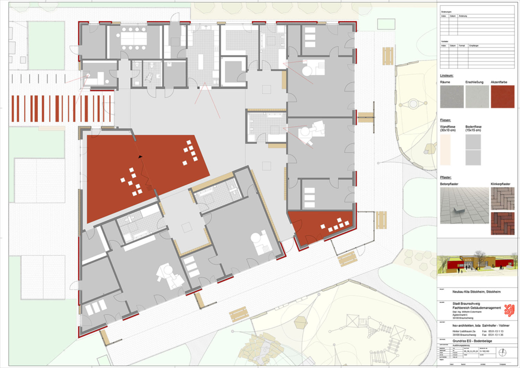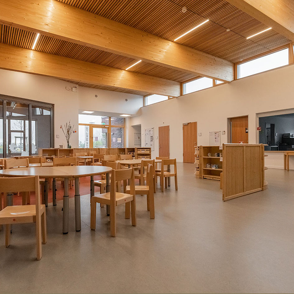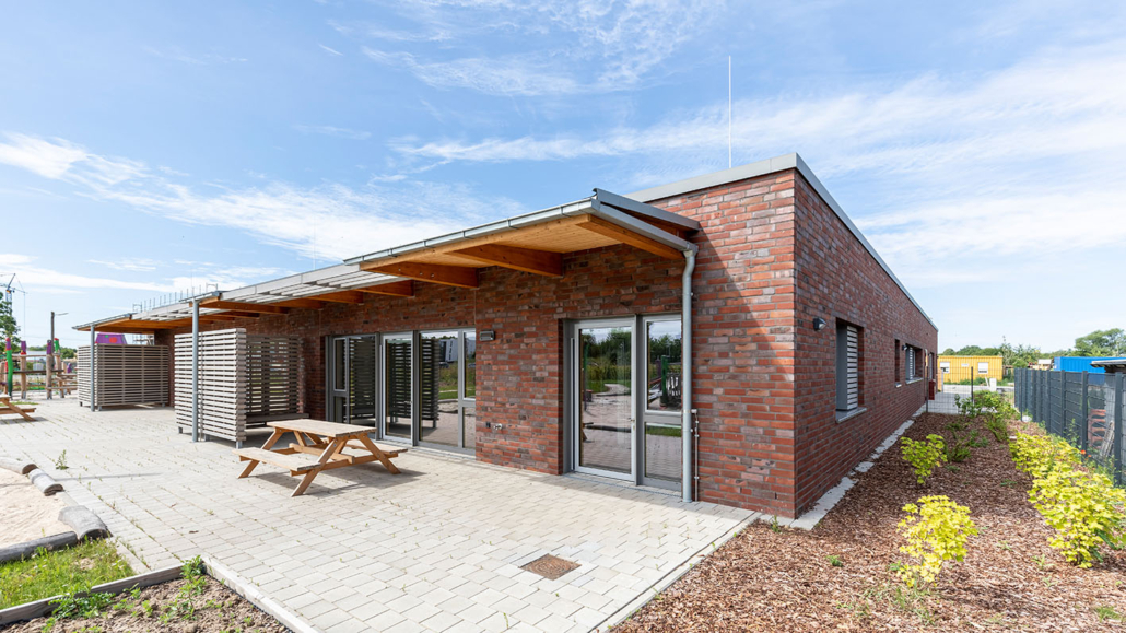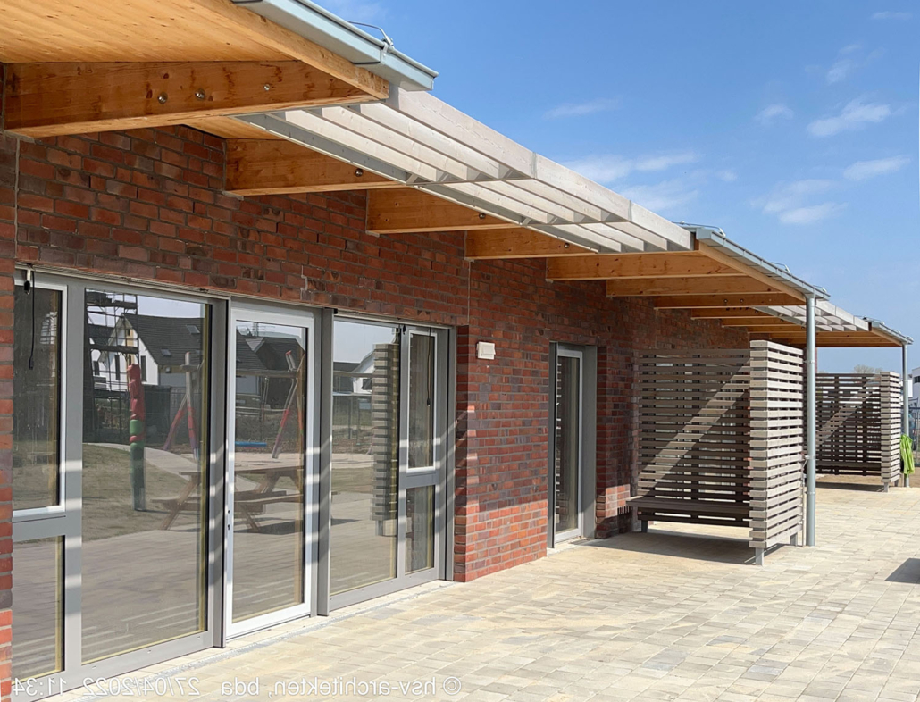 Alle Gruppenräume der Kita orientieren sich idealerweise nach Osten oder Südosten. Eine teilweise überdachte, umlaufende Terrasse mit integrierten Sitzbänken leitet von den Gruppenräumen über in den großzügigen Freibereich. Die Verwaltung, die Küche und die Personalräume befinden sich im nördlichen Gebäudeflügel.