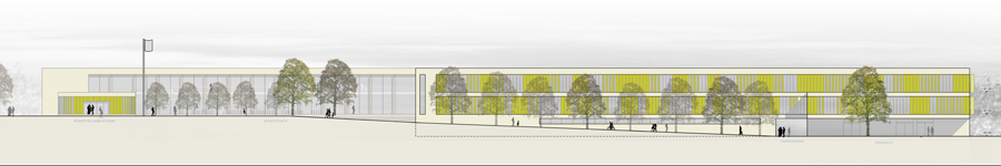 An der nördlichen Nahtstelle zwischen Weststadt und weitläufigem Landschaftspark soll die neue Wilhelm Bracke Schule für ca. 1.400 Schüler entstehen. Die Verfasser wollen mit dem vorliegenden Entwurfskonzept den pädagogischen und schulorganisatorischen Besonderheiten einer integrierten Gesamtschule ausreichend Raum geben und differenzierten baulichen Ausdruck verleihen. Ziel ist es, einen städtischen Schulkosmos mit differenzierten Raumfolgen aus Straßen, Plätzen und Höfen entstehen zu lassen. Dabei wird die Schule als ganzheitlicher Lernort verstanden, der sich nach Süden zur Weststadt mit einem öffentlichen Eingangsplatz und nach Norden zum Landschaftspark mit schulinternen Höfen und Freiflächen orientiert. Die Ausnutzung des Höhenversatzes im Gelände ermöglicht neben der Haupterschließung vom Rheinring auch einen zweiten, untergeordneten Zugang für die Schüler. Über diesen öffentlichen Stadt- und Eingangsplatz, der die Adressbildung zum Rheinring darstellt, öffnet sich die Schule zur Weststadt. Neben der Haupteingangsgeste bietet dieser Stadtraum Platz für Veranstaltungen wie Stadtfeste und Freizeittreffen. Hier ist auch die Stadtteilbibliothek als eigenständiger Baukörper angeordnet.