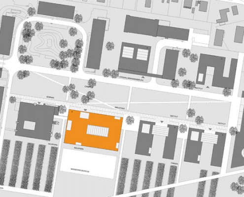 Diese beiden übergeordneten Bausteine repräsentieren das öffentliche, gemeinsame Leben in der Uni, während die ehemaligen Unterkunftsgebäude die Institute beherbergen.